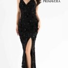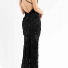 Crisscross low back , fitted body; high slit; sequins beaded 3 D flowers, v neck.